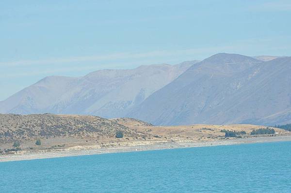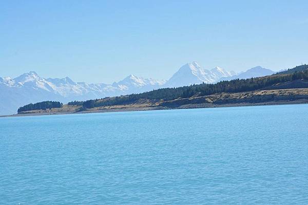 路經美麗的牛奶湖, 當然一定要看一下, 果然顏色是大家所說的乳白色牛奶湖, 遠方還可以看到 Mt. Cook(?)...