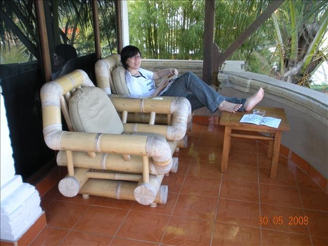 因為我們前一天定早餐是9。30要用,想說那一早起來,先洗個澡游個泳。於是洗完澡call櫃檯說我們要游泳,等了一下,不知道是櫃檯要來帶我們還是我們要去櫃檯等人帶,所以就走到櫃檯那邊摟。(第一天介紹環境的時候,就有說如果我們要游泳,要打電話先跟櫃檯說,櫃檯會幫我們準備)櫃檯已經準備好兩條泳巾給我們,示意我們可以走去泳池游泳了。到了泳池,欸,怎麼這麼小阿,是跟照片沒什麼差別,也蠻漂亮的,但是泳池的長度大約只有10m吧,好短,仔細看一下才發現,泳池的深度也很有趣,從中切開兩部分,深度約為1m&2m,你沒看錯,真的就是這樣,我稍微下水游了一下,覺得不怎麼好游,所以一下下就上來了。我家的說那個2m的太危險,不想游。。。待了一下下我們就走了。