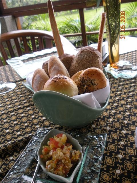 先送上來的是麵包,麵包是他們加自己在做而且有個bakery在賣的,好吃,法國麵包內軟外香,麵包的口感都很紮實,還有附上蕃茄蒜泥醬可以一併食用