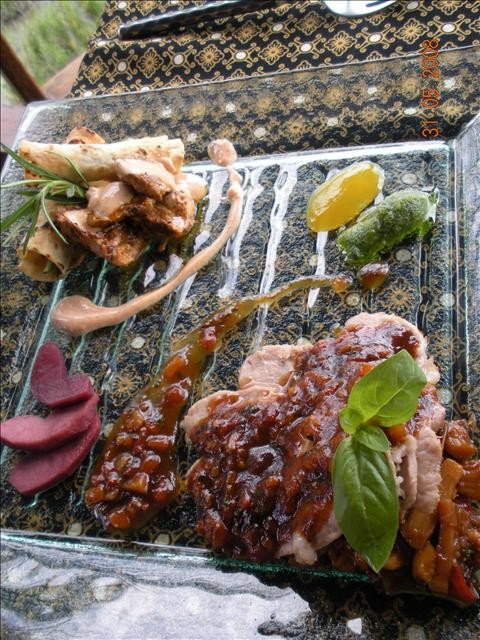 已經有點忘了點的是什麼,我的前菜點的是綜合特調沙拉,主菜是兩種魚料理,甜點是草莓香瓜冰淇淋之類的;我家那隻點的是菇XXX的前菜,我本來預計要點的,主菜是豬排,甜點是巧克力蛋糕。