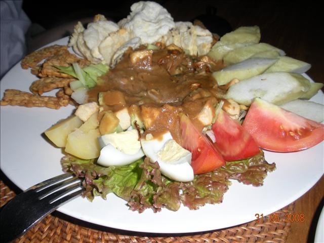 咖哩雞還ok,有附飯,雞肉有點老,咖哩蠻好吃的;蕃茄湯跟髒鴨的不一樣,就是單純的蕃茄湯,普通,髒鴨比較好喝;Gado Gado我們沒吃完,不合口味~這餐花了11萬5。不怎麼樣。。。
