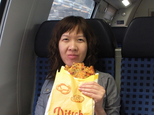 Day1 : 法蘭克福機場 早上6:00 到德國,在飛機上沒睡好,不過還是有睡。 到我們訂的旅館,39歐特價不含早餐,划算。行李可以寄放在櫃台,也可借用洗手間稍做梳洗。櫃台英文很好~ 前往海德堡的慢車上,旁邊是在車站買的薄餅,很鹹。 咖啡倒是意外的好喝,不過後來發現德國的咖啡普遍都不錯又便宜,以德國的收入來說。